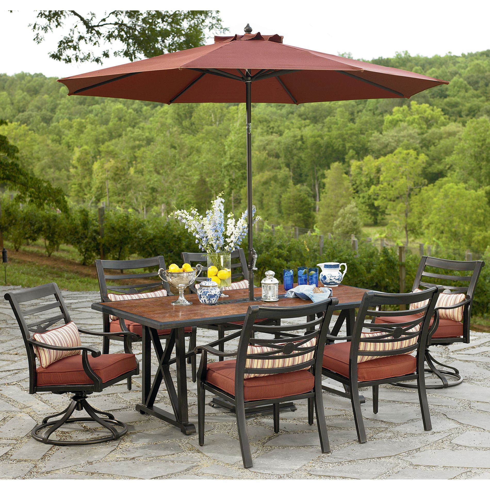 Relax in your backyard with this cozy set. Includes 1 table, 4 stationary chairs and 2 swivel rocker chairs. Rust-free aluminum frame and olefin cushions resist weathering for enduring good looks. Read more