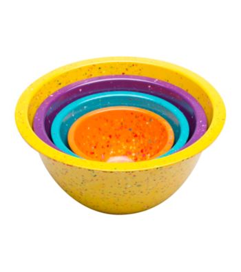 Mixing Bowls. Web exclusive! You ll love the versatility of this nest bowl set! The Zak Designs Confetti Pub Nested Assorted Yellow Bowl Set will make every meal seem like a party. Made from durable recycled melamine, these bowls are colorful, easy to care for and look great on an everyday table setting or outdoor patio picnic. You can mix and serve salads, dip, cookie dough the list is endless. Being environmentally friendly never looked so fun! Yellow Bowl sizes: 4.4 qt, 2.5 qt, 1.25 qt, and 18 oz. Do not use in microwave Dishwasher safe Patented Recycled melamine Imported Read more